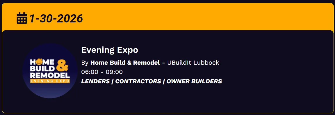 Join us in Lubbock, TX for a three hour event of inspiring keynotes, dinner, and new connections at the Home Build & Remodel Evening Expo for homeowners, DIYers, and home builders.